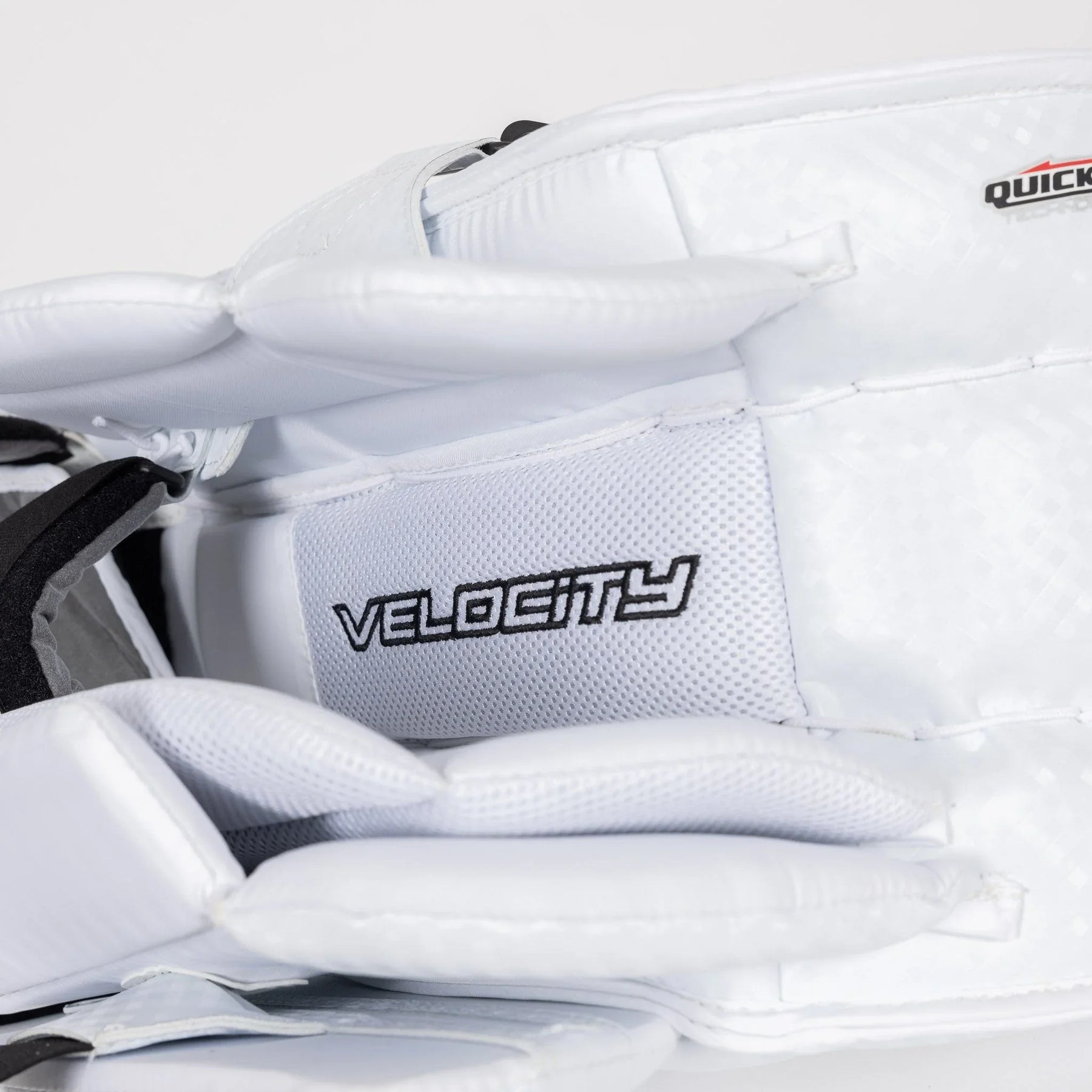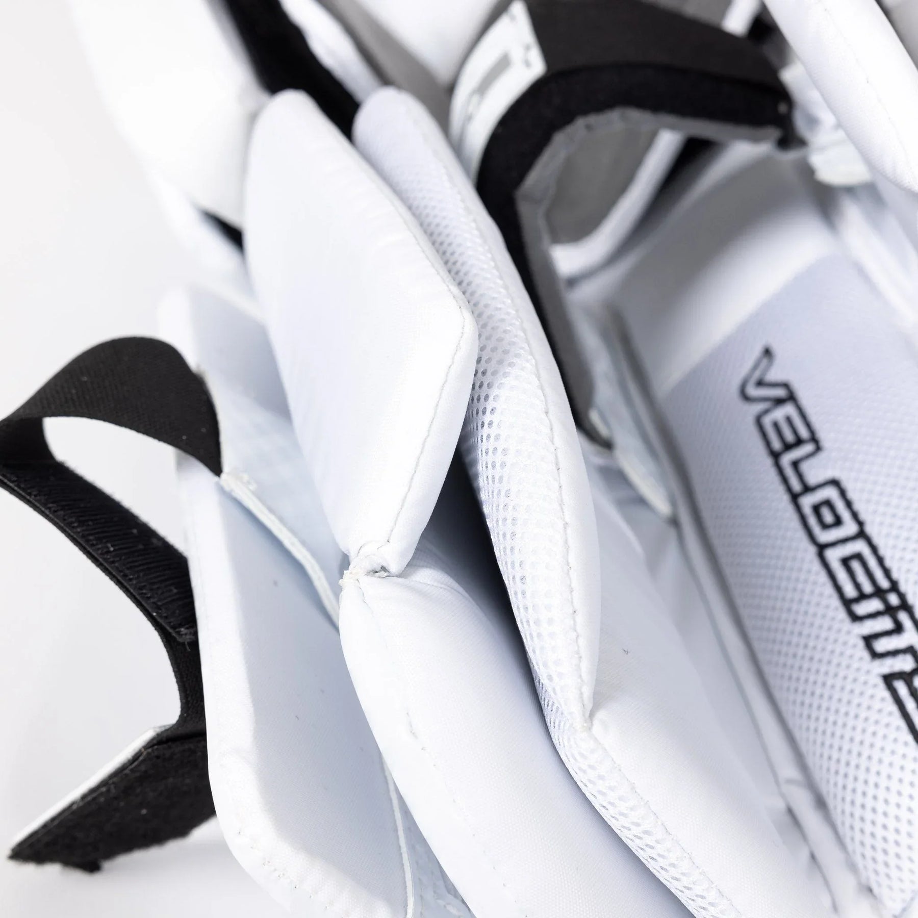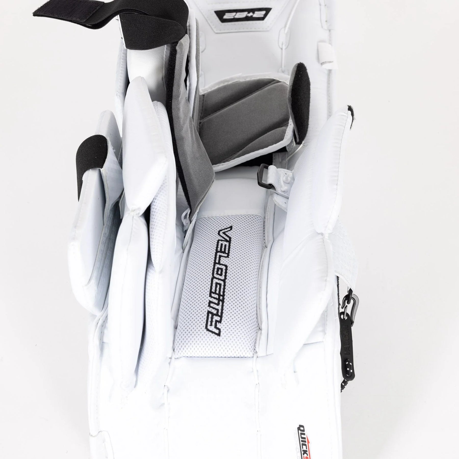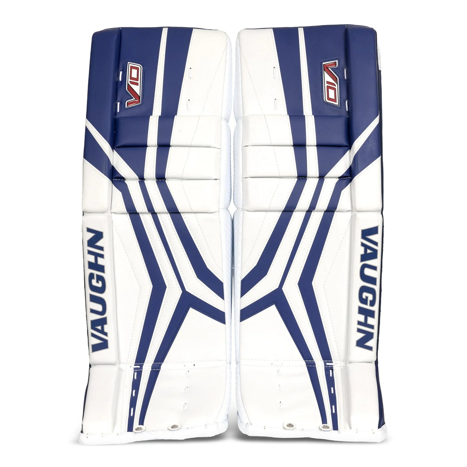 Best price guaranteed.The Vaughn Velocity V10 Junior Goalie Leg Pads boast a firm front surface that enhance active rebounds. It features quick-slide material on the inner pad edge and a bottom trim with the same material. The inner leg cradle is wide and has an extended shape for added comfort. The pad provides extended back leg coverage and showcases a lower profile outside roll with a single break style. With a 2-inch thigh rise and square-shaped inside edge, the pad offers improved coverage. Its outer panel profile is thinner for reduced bulk and it is pre-curved for precision.