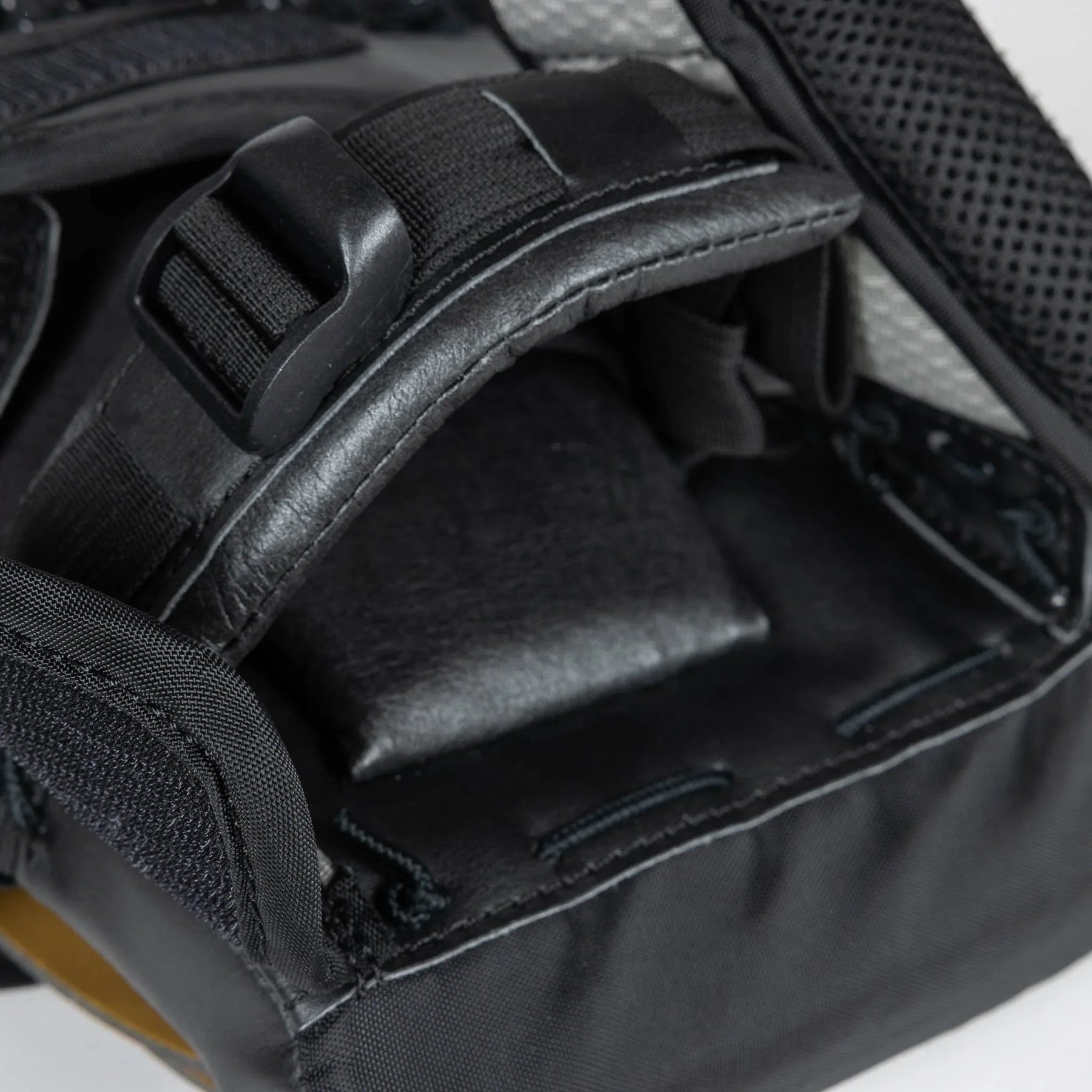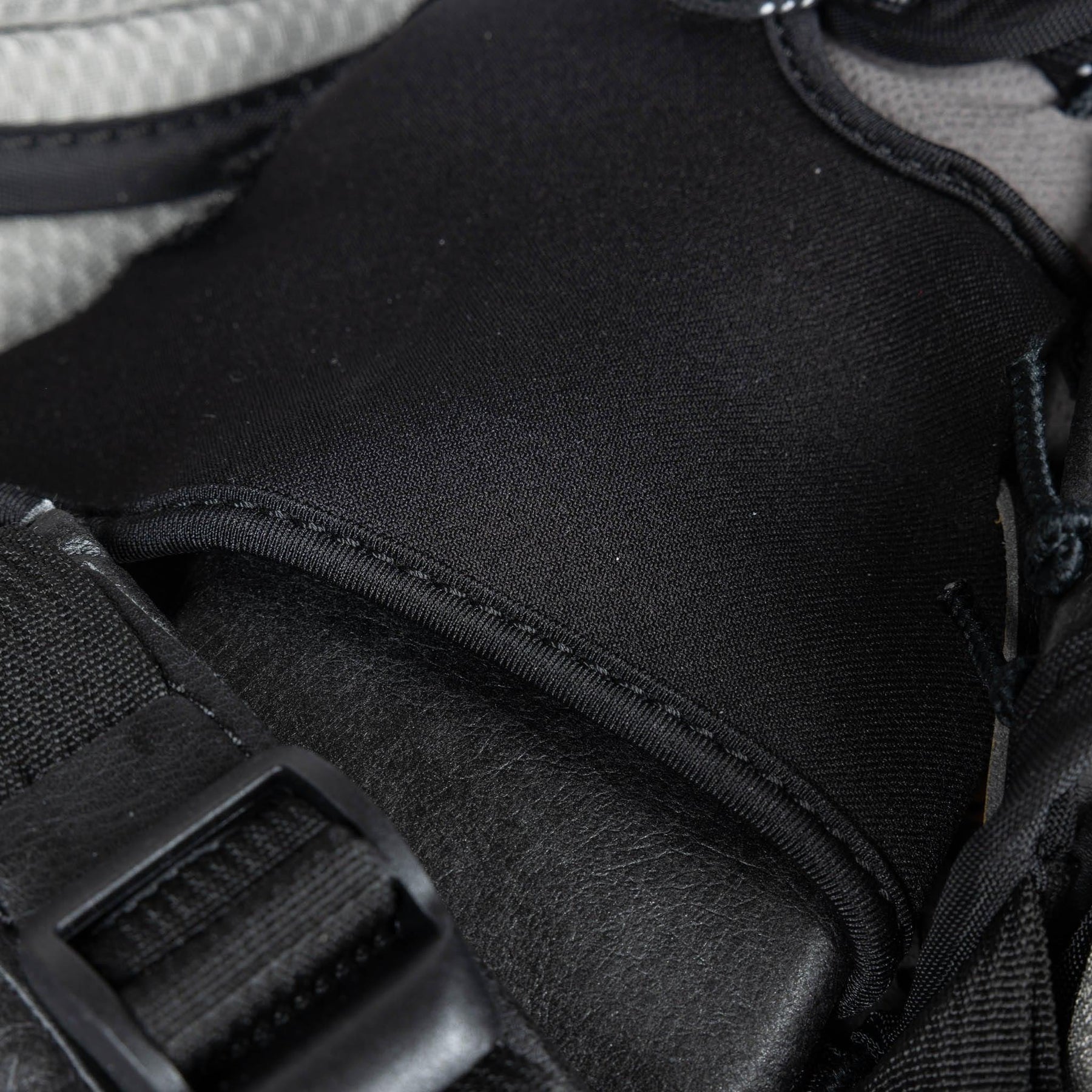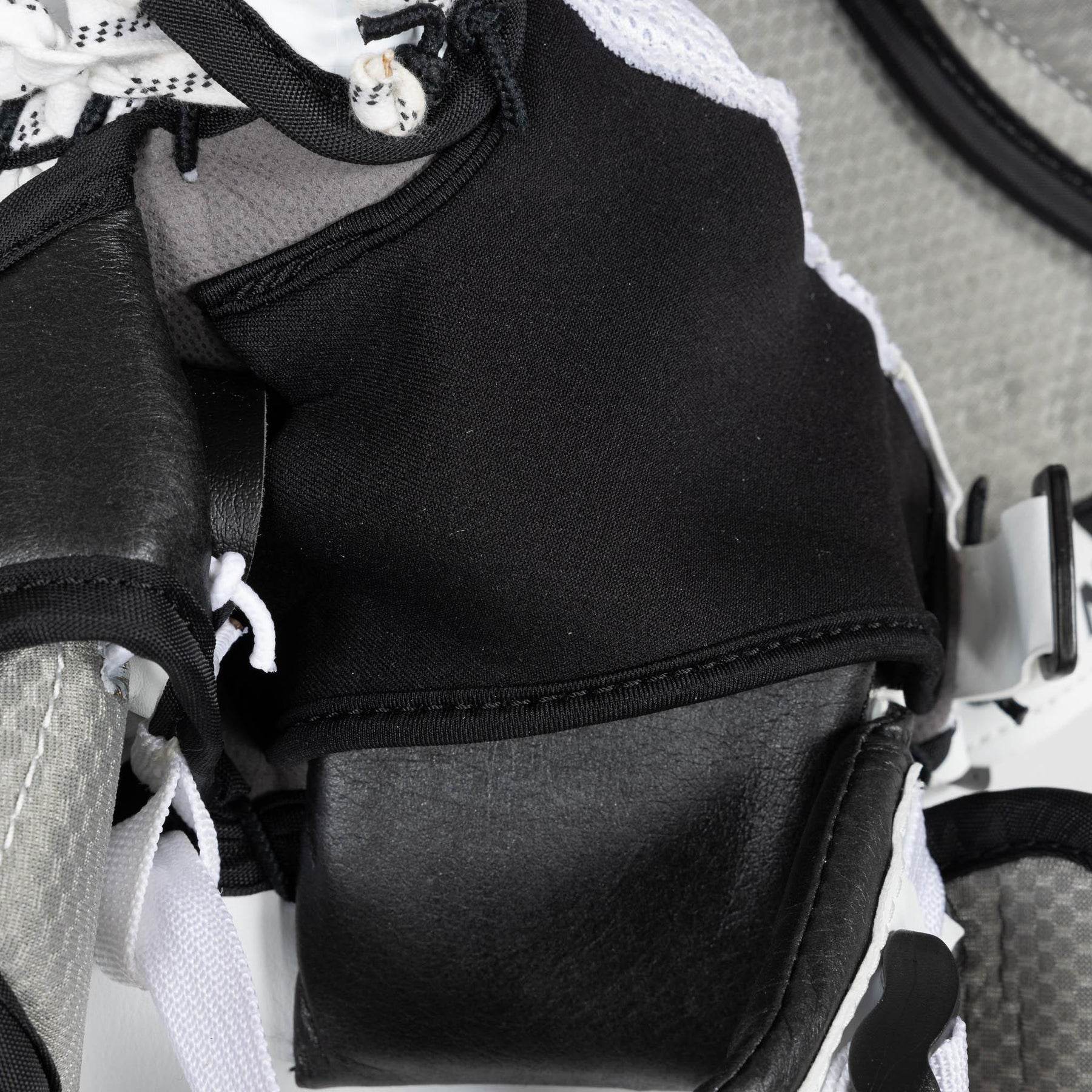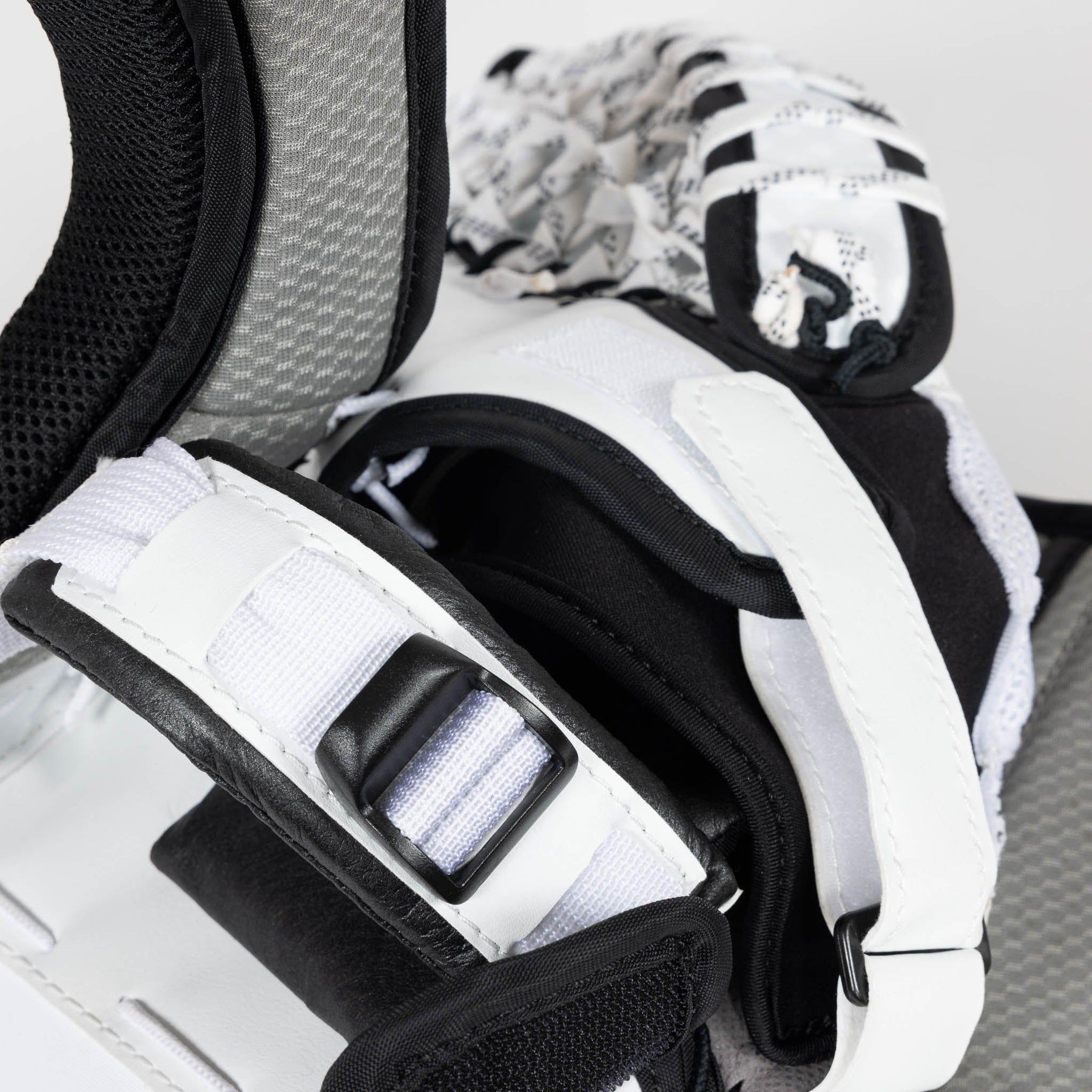Next you want to ensure the adjustable wrist strap goes directly across the wrist bone, and has minimal to no interference with your chest protector. The goaltender should be able to swivel their wrist to accommodate a range of save selections without any restrictions from the chest protector.