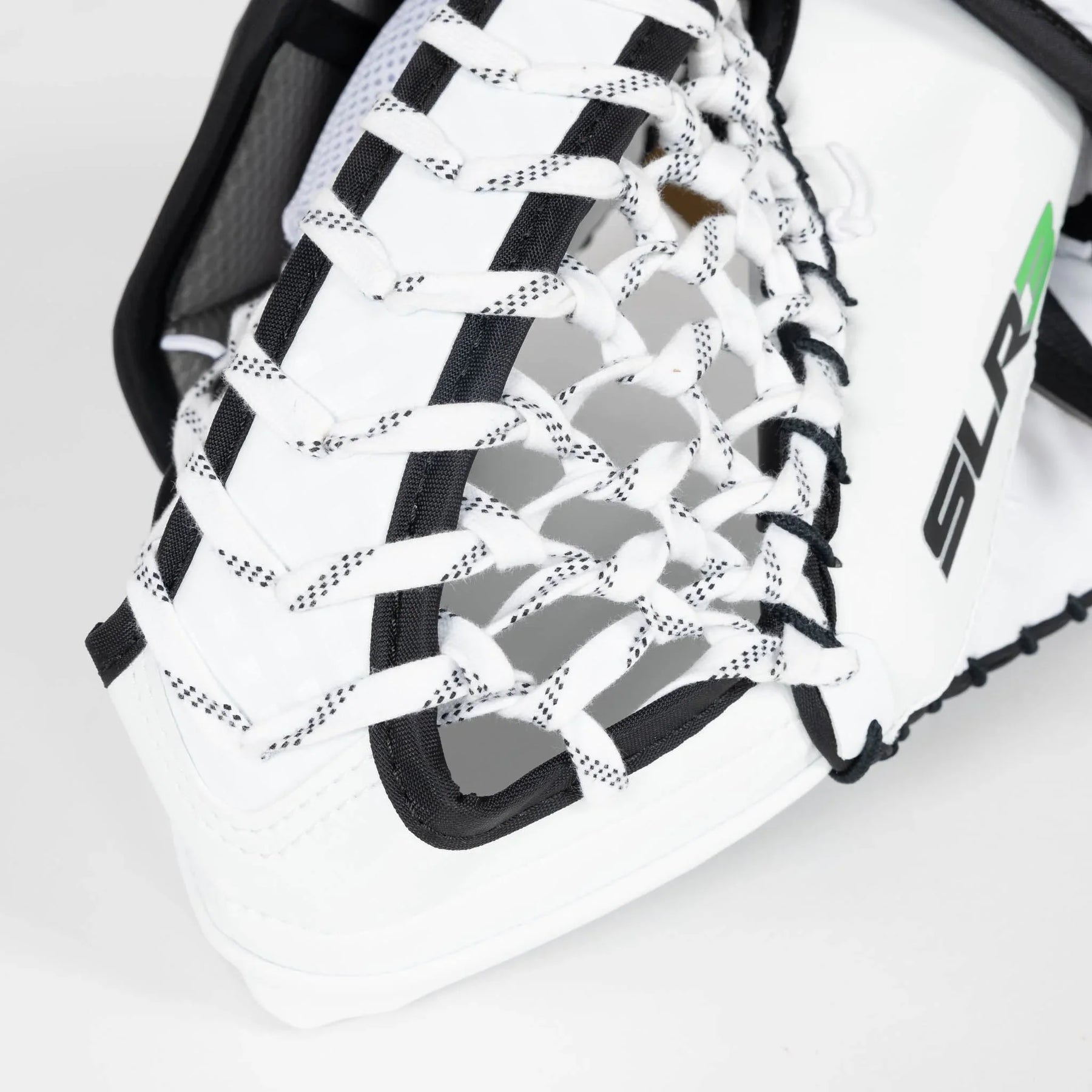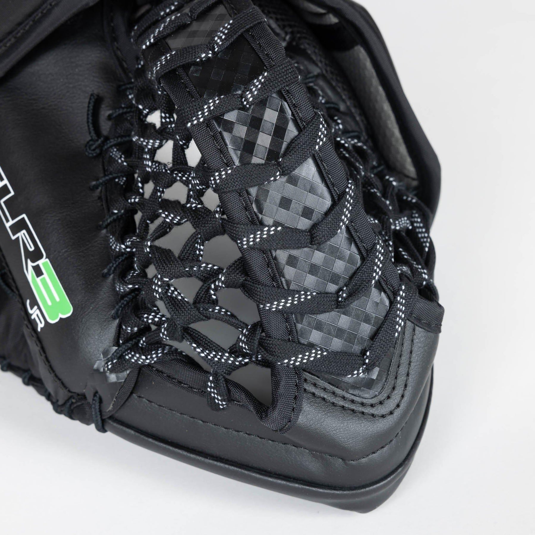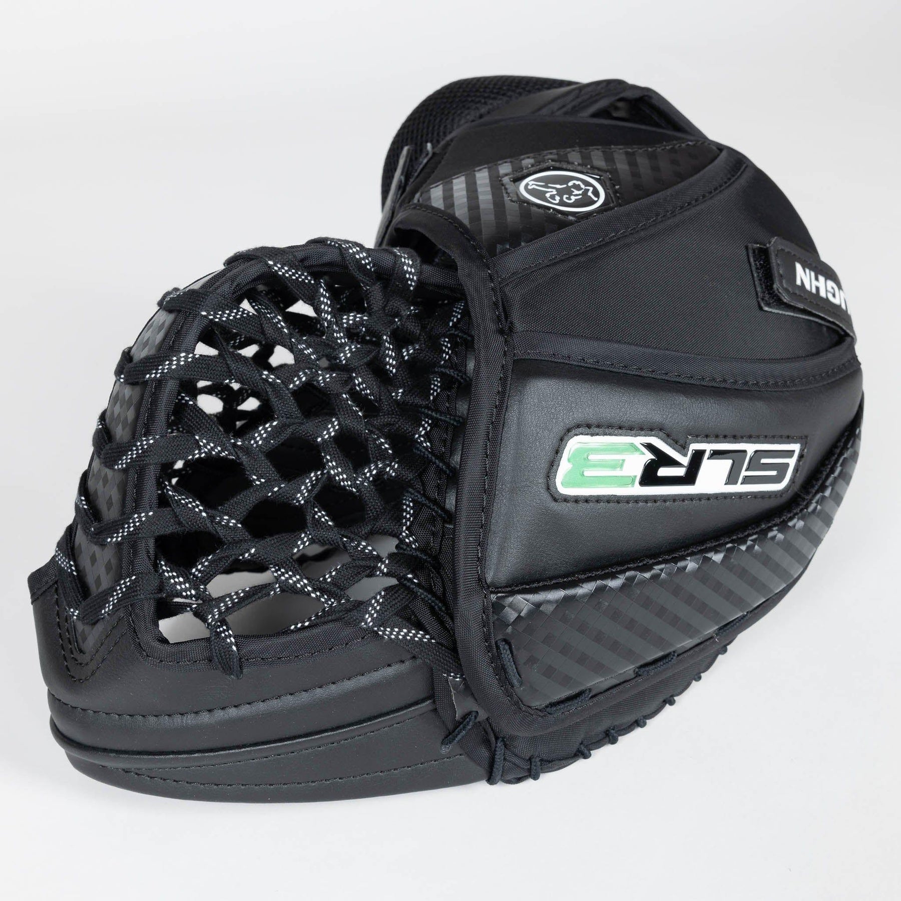 The palm has more padding in this iteration, and the fingers have been reinforced at the perimeter. The fingertip deflecting rail directs the puck down into the pocket, making catching saves easier. The newly solidified thumb on the SLR3 covers more surface area.