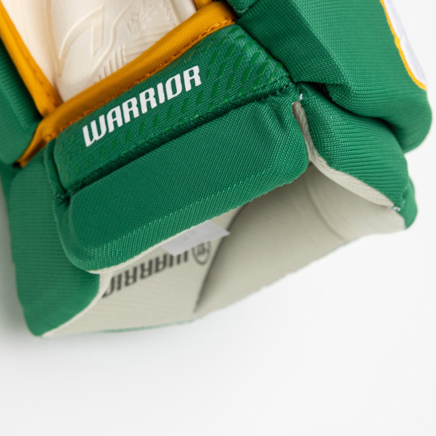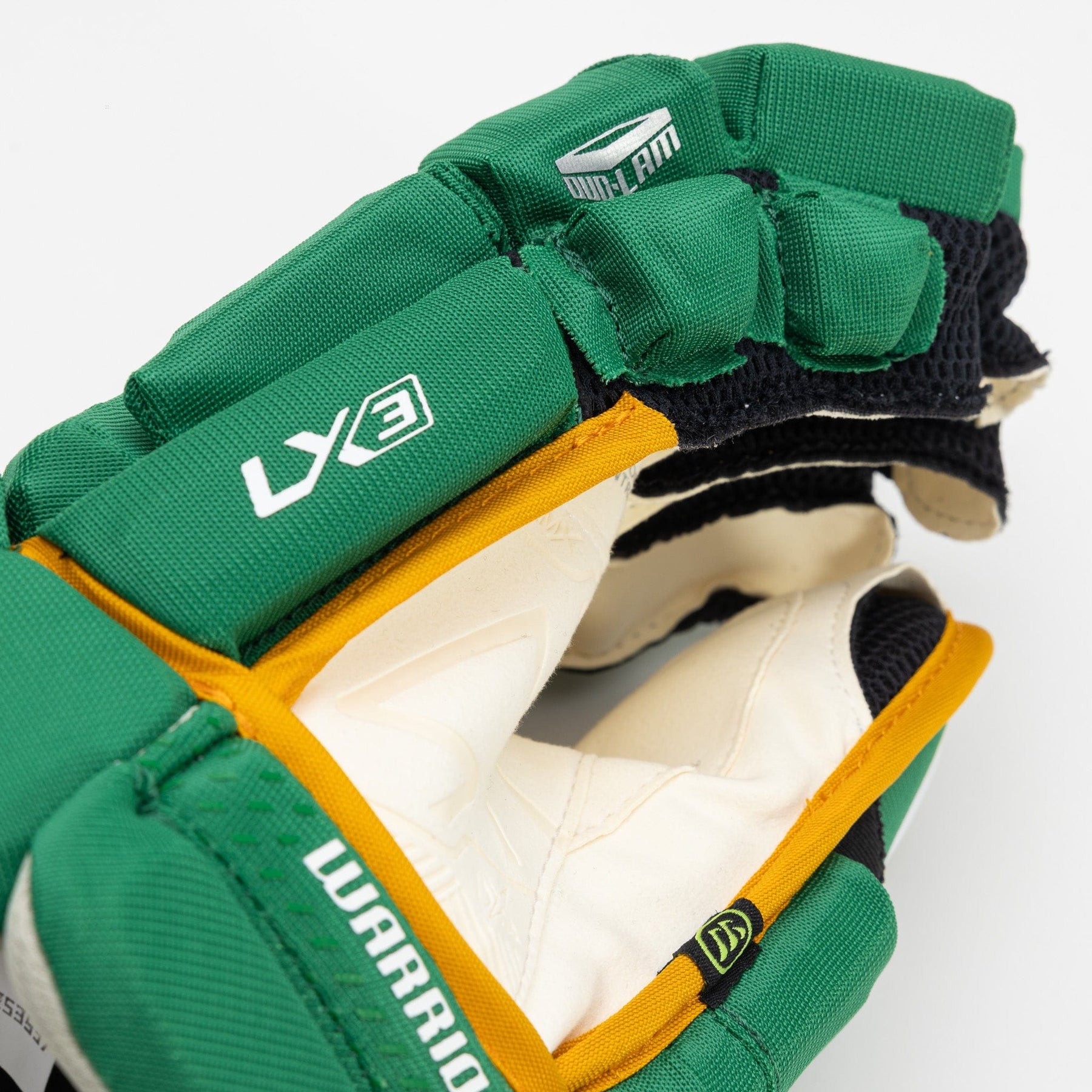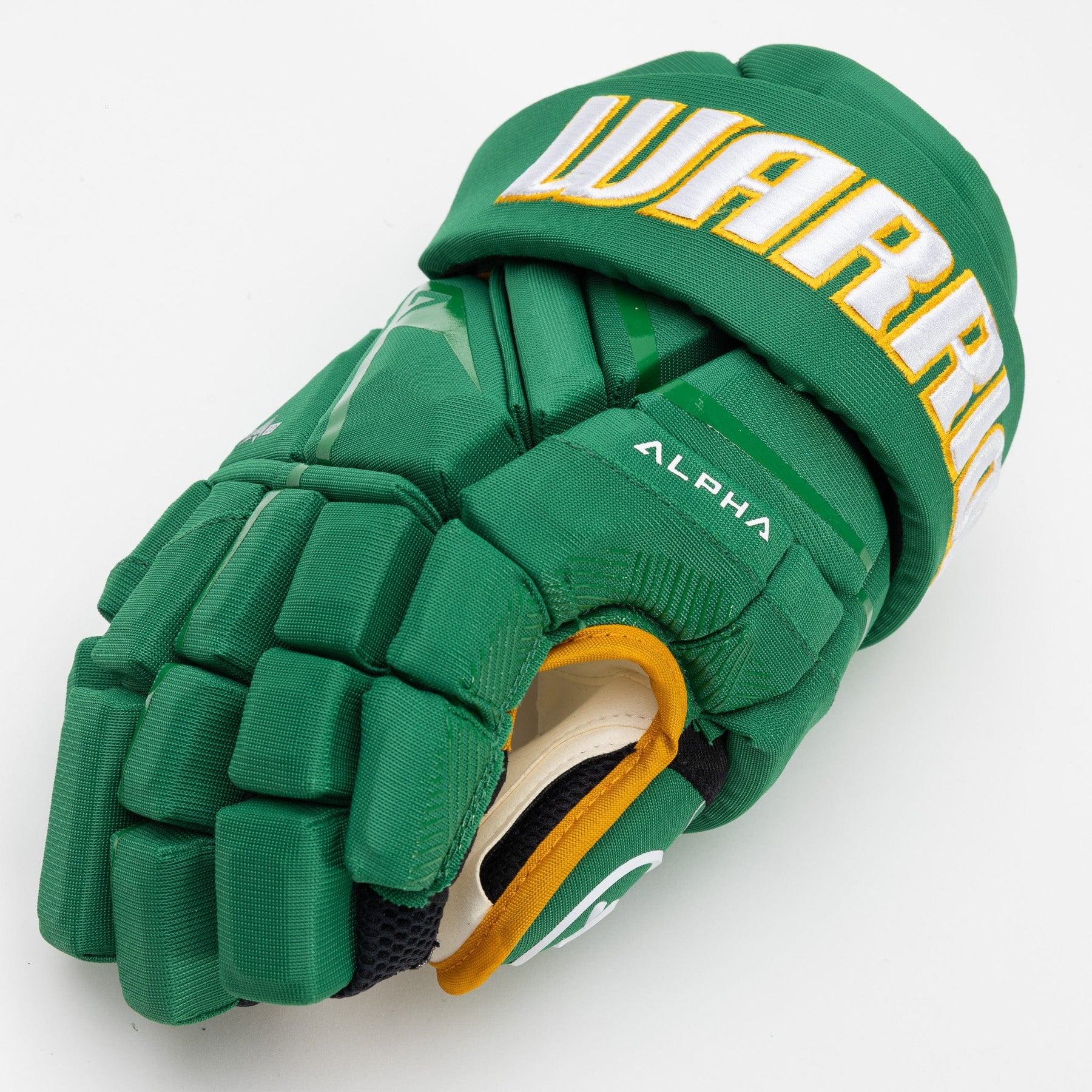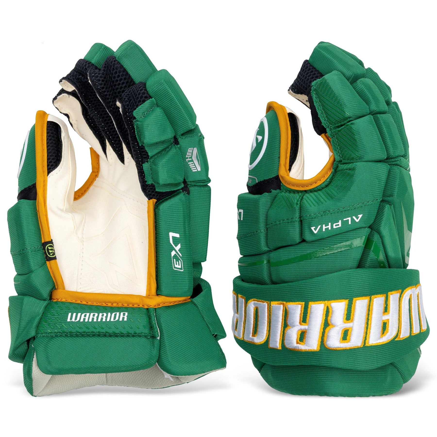 Best price guaranteed.The Warrior Alpha LX3 Pro Stock Senior Hockey Gloves are pro returns from professional hockey players. Designed with comfort and protection in mind, these gloves have integrated HD foams to provide protection in all areas. Featuring a Green colorway inspired by the Minnesota Wild, and available in a variety of sizes, these gloves are a great option for hockey players.