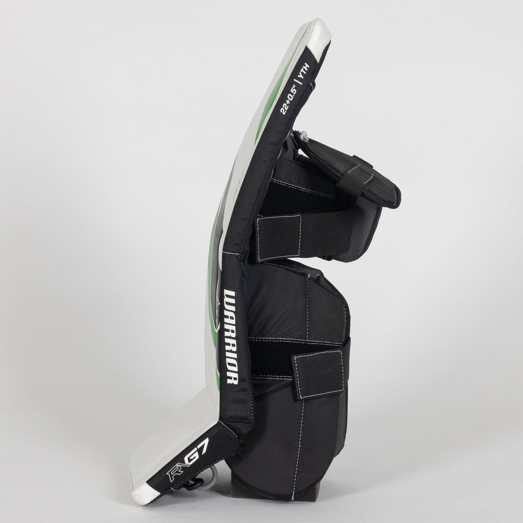 The Warrior G7 Youth Goalie Leg Pads are available in colors Black, White and White/Black/Green. Available also in sizes 20+0.5"-24+0.5".