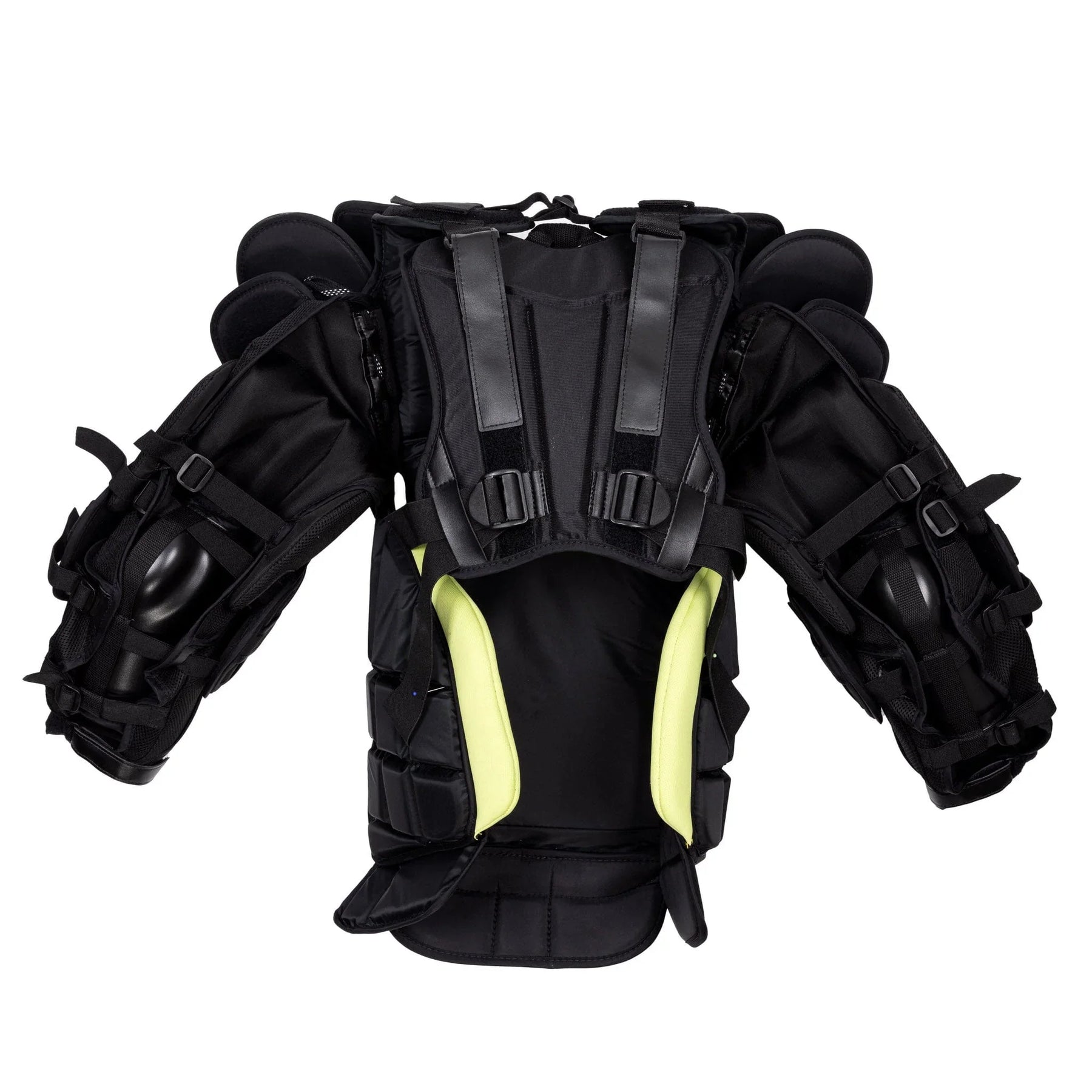 - 2. The elbow of the goaltender fits securely into the pocket of the elbow protection, and doesn't shift too far away from them. Keep in mind, arms usually have to be adjusted and positioned properly while putting on your chest protector.
